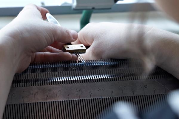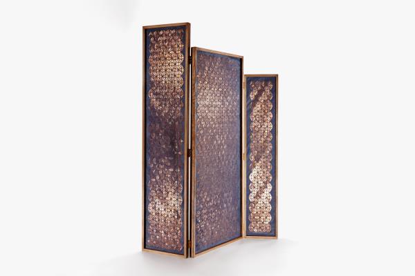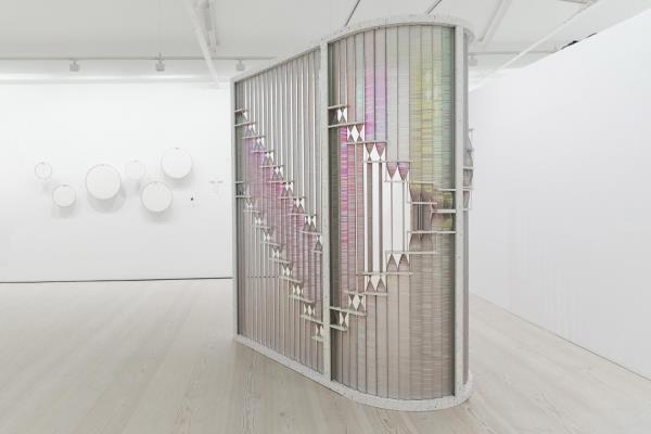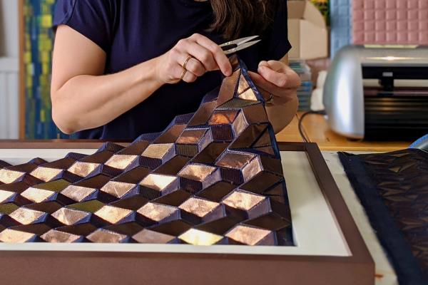 Fay McCaul creates luminous knitted panels inspired by architectural forms. Her pieces incorporate a mix of reflective materials inside knitted pockets. She builds up rows of pockets and places tiles of various materials inside: plastic, mirrored, painted plywood, and etched metal. These inclusions give Fay’s textiles a quality of light and movement not found in traditional fabrics. She has also invented an entirely new textile surface that encapsulates reflective materials via a heat bonding process. Fay’s work has been exhibited widely from London to Shanghai and been featured in Elle Decoration, Design Boom and Architectural Digest.