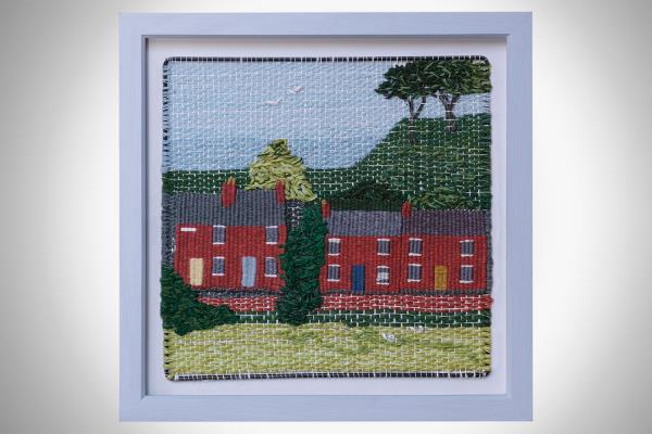 The early stages of Jackie Bennett’s tapestry weaving career saw her make her own weaving frame and teaching herself the craft from a small booklet. Experimental in approach, she worked in various materials, dyeing her own yarns. Inspiration came from the textile artist Frances Geeson, who taught her macramé and fabric collage. Her love for the craft comes from being able to get hands-on with materials such as fibre, clay and wood. Eventually, she specialised in woven textiles, training in traditional tapestry weaving rather than cloth weaving. Her artistic nature brings out a need to express ideas through her woven pieces, rather than producing functional items. Her first piece was a view of the town of Lewes, of red-brick houses and Lewes Castle.