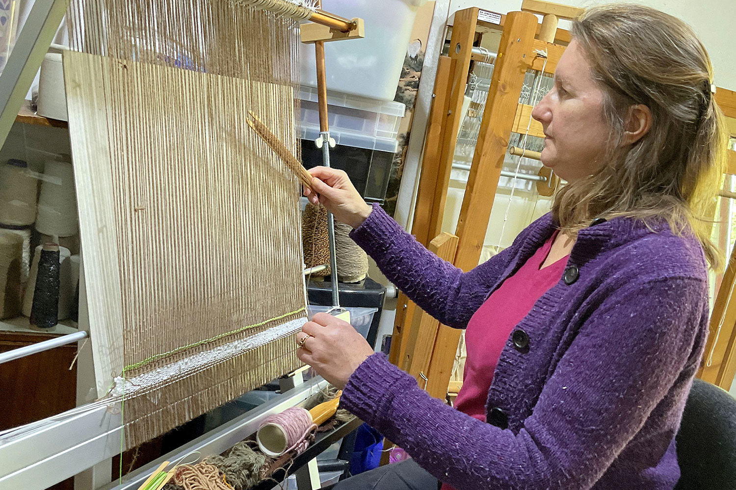 I weave both intuitively and in response to my designs and sources of inspiration. The techniques are traditional, but the designs are innovative. My choice of fibre – such as cotton, hemp or jute – depends on the textural effects I use to bring about a connection and emotional resonance.