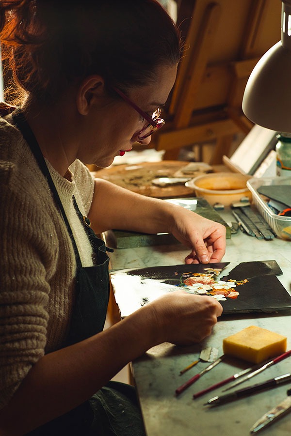 A mosaic artist and restorer specialised in the commesso fiorentino technique, Lituana Di Sabatino was still a student in Painting at the Academy of Fine Arts of Bologna, when a trip to Florence determined her future career. She visited the museum of the Opificio delle Pietre Dure, which is a historical semi-precious stones workshop and nowadays an important restoration centre. Lituana was so impressed by the stone work there that she decided to train as a Florentine mosaic maker. After graduating, she moved to Florence and become an apprentice in the workshop of master Roberto Marrucci. "He was an excellent teacher, passing on not only his skills but also the passion for his craft. He used to take me to see quarries where I learned everything about stones,” Lituana remembers. “He lighted a fire in me.”