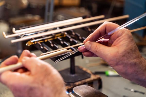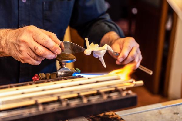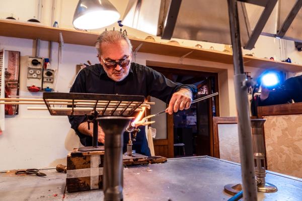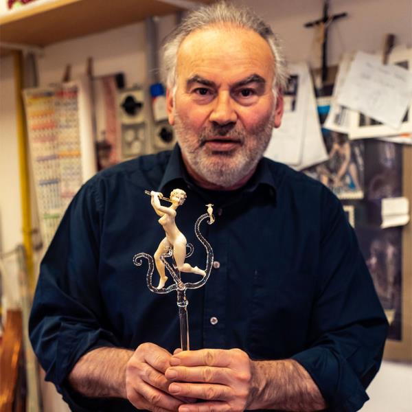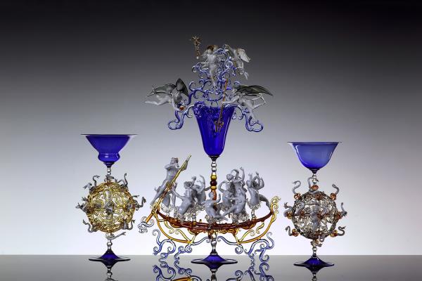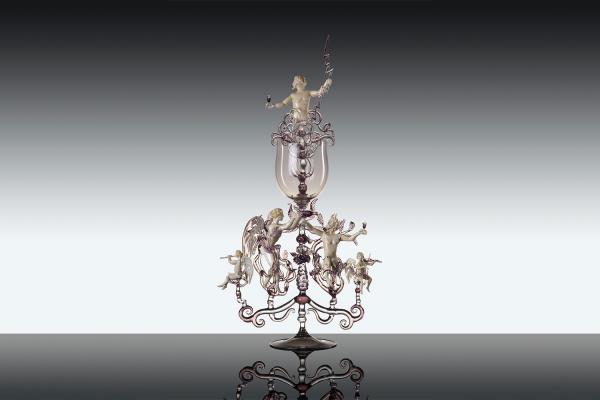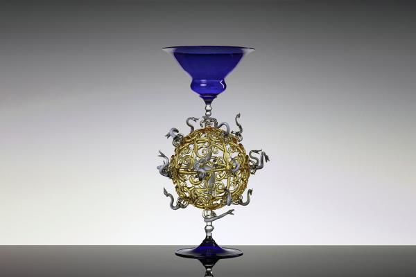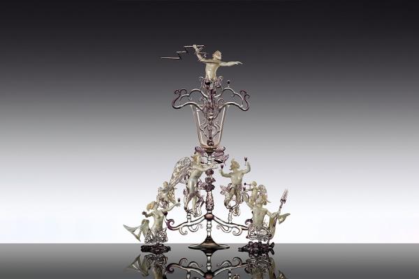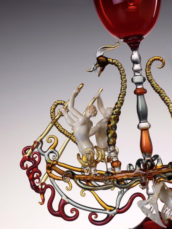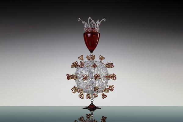 Master lampworker Lucio Bubacco possesses a technical expertise, knowledge of colour and of the nature of glass that allows him to create inimitable works: figures entirely shaped by hand and included in blown glass or castings. “In my works, I represent mainly scenes of bacchanalia, with satyrs, nymphs, angels, gods, mythological figures set in dramatic or erotic scenes. But it's all very figurative and realistic.” In his recent “Escape from coronavirus,” Lucio mixes current events with history, depicting Charon on a boat with the damned, two devils pulling them along and above Hermes the god of medicine with two angels protecting him. On the side, two chalices surmount two spheres that look like the coronavirus, with glass snakes projecting out of them. “It took me a couple of months to make it but the idea is a glance, a split second.”