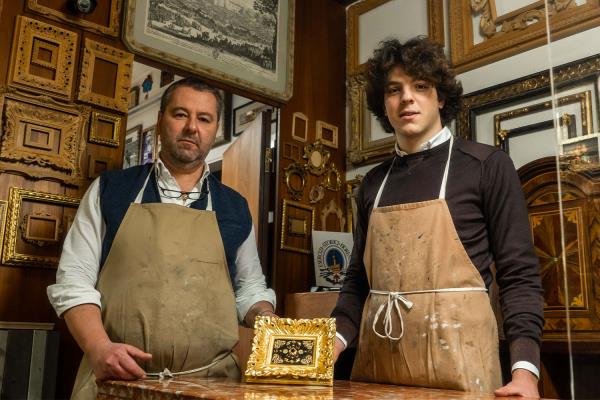 The Maselli family shop was first opened in 1955 in the heart of Florence by Paolo Maselli. The production mainly involved antique prints and handmade frames. Paolo passed down the love for this work to Gabriele, his son, who has been running the family business since 1979. He’s been honoured with the title of master artisan thanks to his impeccable skills in gold-plating, frame restoration and wood carving. Gabriele is now proud to be teaching his craft to his son Tommaso, 20. The young artisan is as passionate about the craft as his father and his talent in wood carving is already exceptional. Today, 60 years since its foundation, Bottega d’Arte Maselli still provides high-quality handmade creations, sold all over the world.