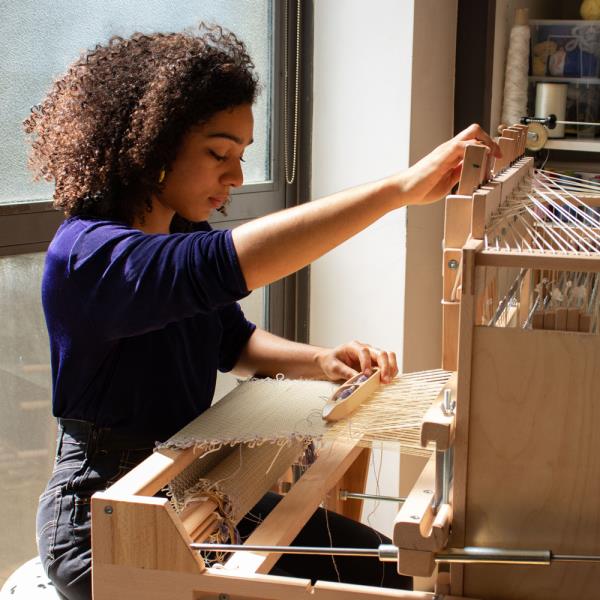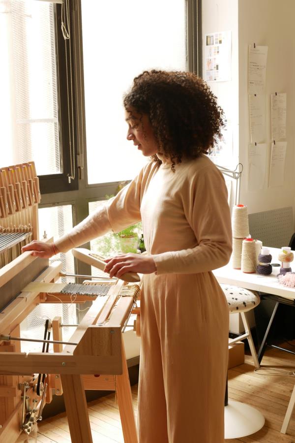 Rose Ekwé's studio merges textile design, weaving and research. She learned the technical know-how at École Duperré in Paris. Her diplomas at HEAR Mulhouse and an internship at Fab Textiles in Barcelona cultivated her interdisciplinary curiosity and innovation around sustainable alternatives for the textile industry. Rose was faced with the limits and polluting properties of many modern materials while experimenting with fine plastic tubes and nylon. Finding an alternative required a lot of creative thinking and research. Rose led the way through empirical research and the support of engineers to develop yarns made from seaweed. “I am using local materials that are invasive – or seen as waste – and finding ways to enhance them. My great desire is for things to remain useful. Circularity is key.”