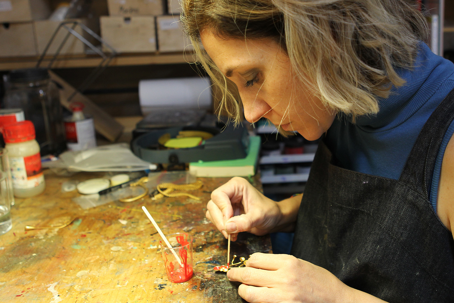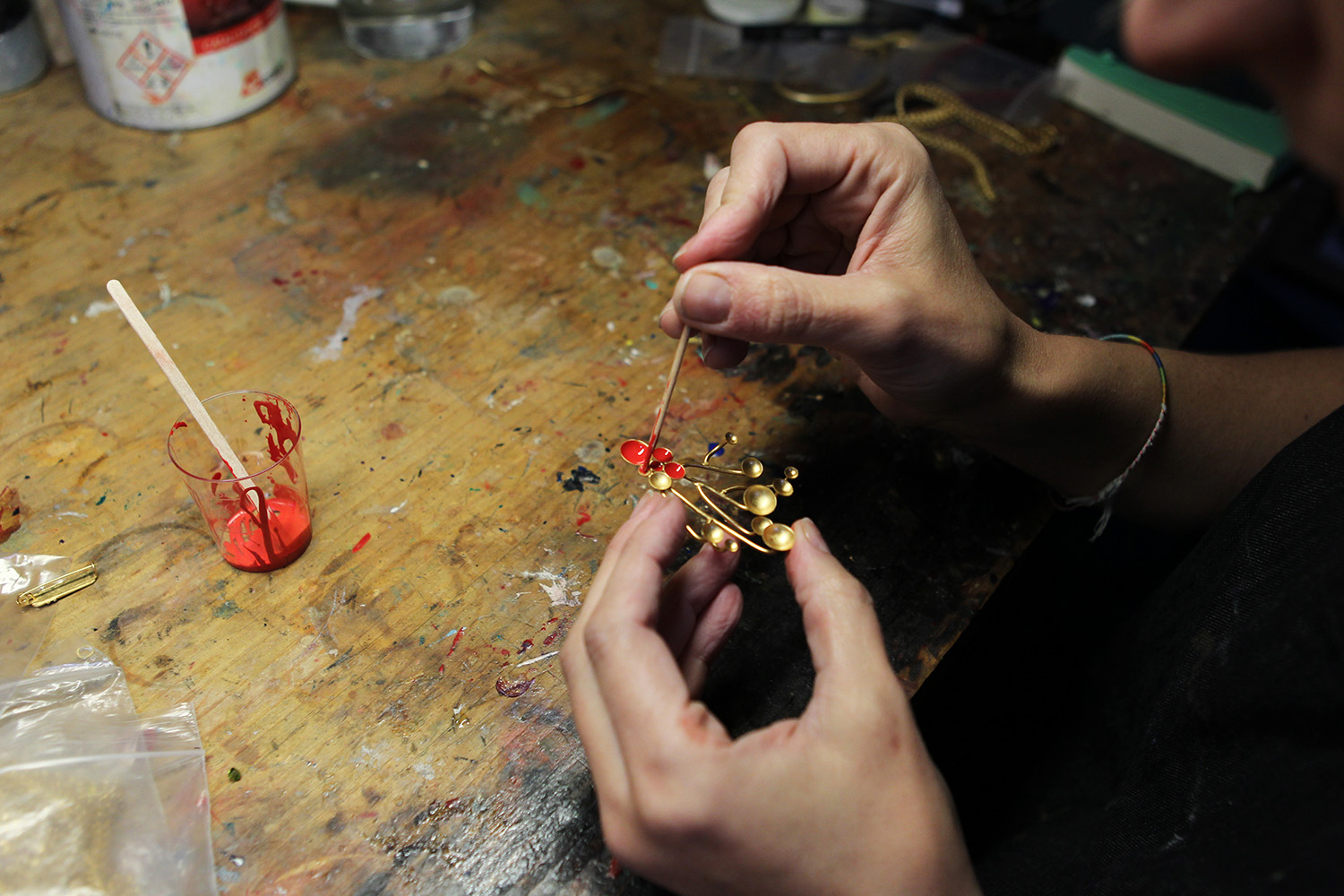 Artisan Maite Tejedor aims to preserve and recover the cold hand enamelling technique which consists of adding colour to metal pigments dissolved in epoxy resin. This technique has virtually disappeared in modern-day jewellery making. It is a completely manual and rigorous process that can take up to 48 hours to complete, for the enamelled piece to reach the desired finish. In Maite's workshop, participants will acquire the basic skills to glaze their pieces by first applying the colour to the jewellery piece and then placing it in the oven at a low temperature for a glossy finish. At the end of the workshop, the participants will take home the jewellery piece as a souvenir that they made themselves.