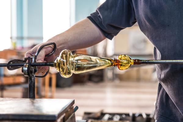 Novotný Glass is placed in a rebuilt complex of buildings connecting the glassworks to a restaurant and a glass museum. The heart of the glass centre is a gas-fired four-pot furnace. Here master glass blowers work daily from early morning until late afternoon. The glass blown items are cooled down in annealing furnaces and during the night the furnace loaded with ready-made glass pellets, that meet the standards for marking crystal glass.