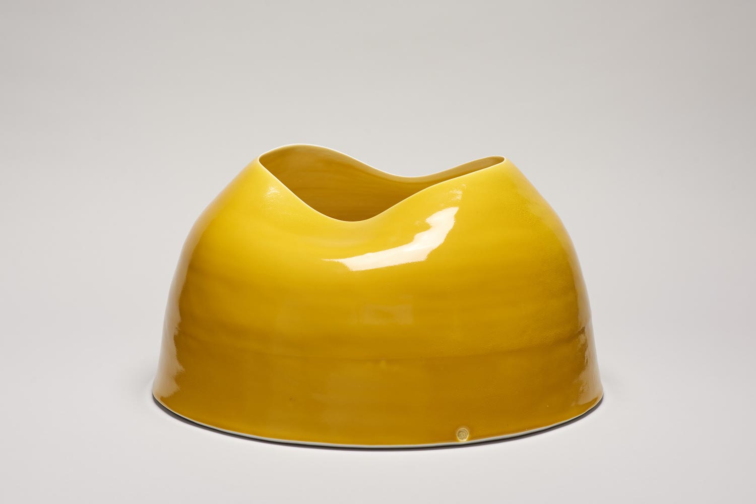 This small oval table vase has a curved opening and a bright yellow glaze. It is made of turned and manipulated porcelain, and high fired in a reduction firing of 1260°C.