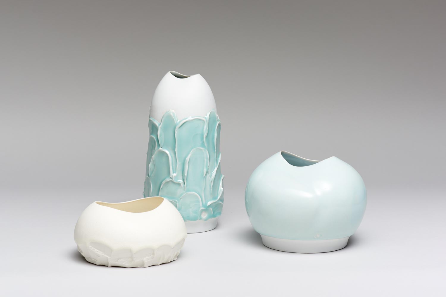 This work consists of three vessels of different heights, which are similar in their oval shape but differ in colour and size. The white and light blue glazing and the structures of the individual objects are reminiscent of glacier landscapes. The works are made of turned and manipulated porcelain and fired in a reduction firing of 1260°C.