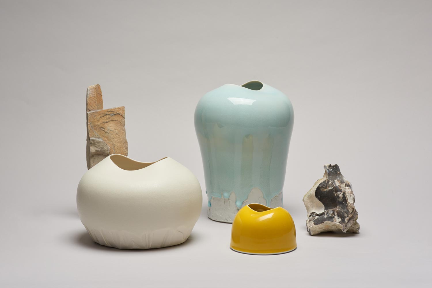 This work consists of three vessels of different heights, which are similar in their oval shape but differ in colour and size. The white and light blue glazing and structures of the two larger vases are complemented by a small bright yellow vase. In combination, the objects are reminiscent of glacial landscapes. The works are made of turned and manipulated porcelain and fired in a reduction firing of 1260°C.