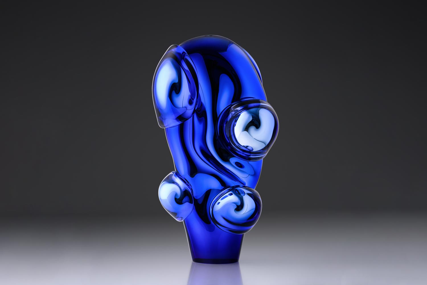 This piece is made using glass blowing, free forming and silvering. The work depicts clouds of shapes merging into one ball. The artist plays with different shades of blue glass.