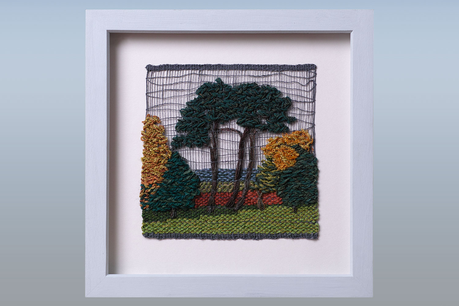 This handwoven wall art depicts three tall pine trees set between lower trees with textured dark green and yellow autumnal foliage. The pale green foreground contrasts with the red brick wall, the open weave sky is in dark grey. It is displayed mounted on plain, acid-free board, in a wooden frame.
