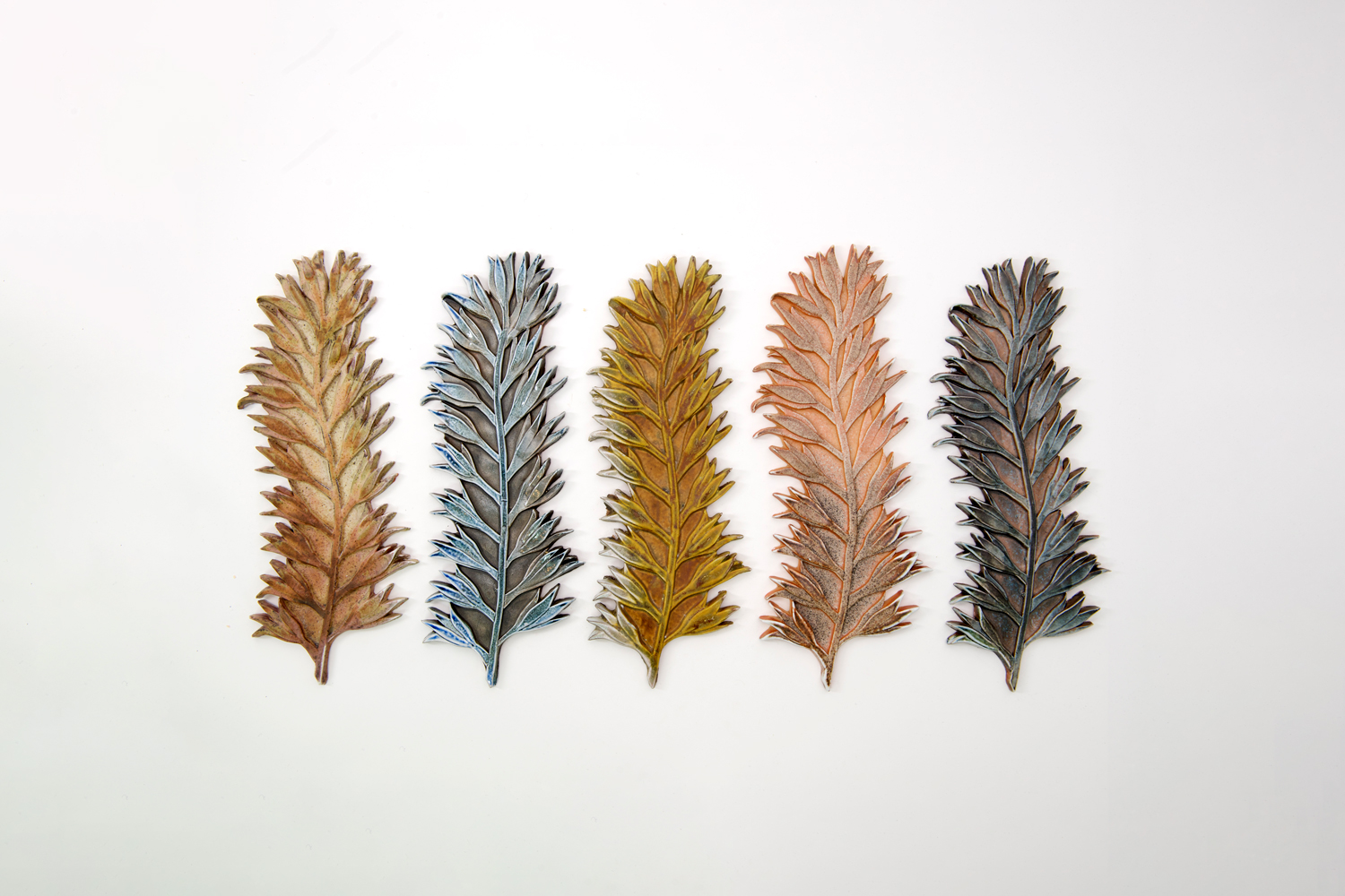 Spikey Plants, from Kay's Botanical Structures series, depicts a row of five leaf-shaped relief tiles, wall mounted. The colours range from pinks and browns to blues and blacks. The tiles are slip cast porcelain fired in a wood kiln with soda.