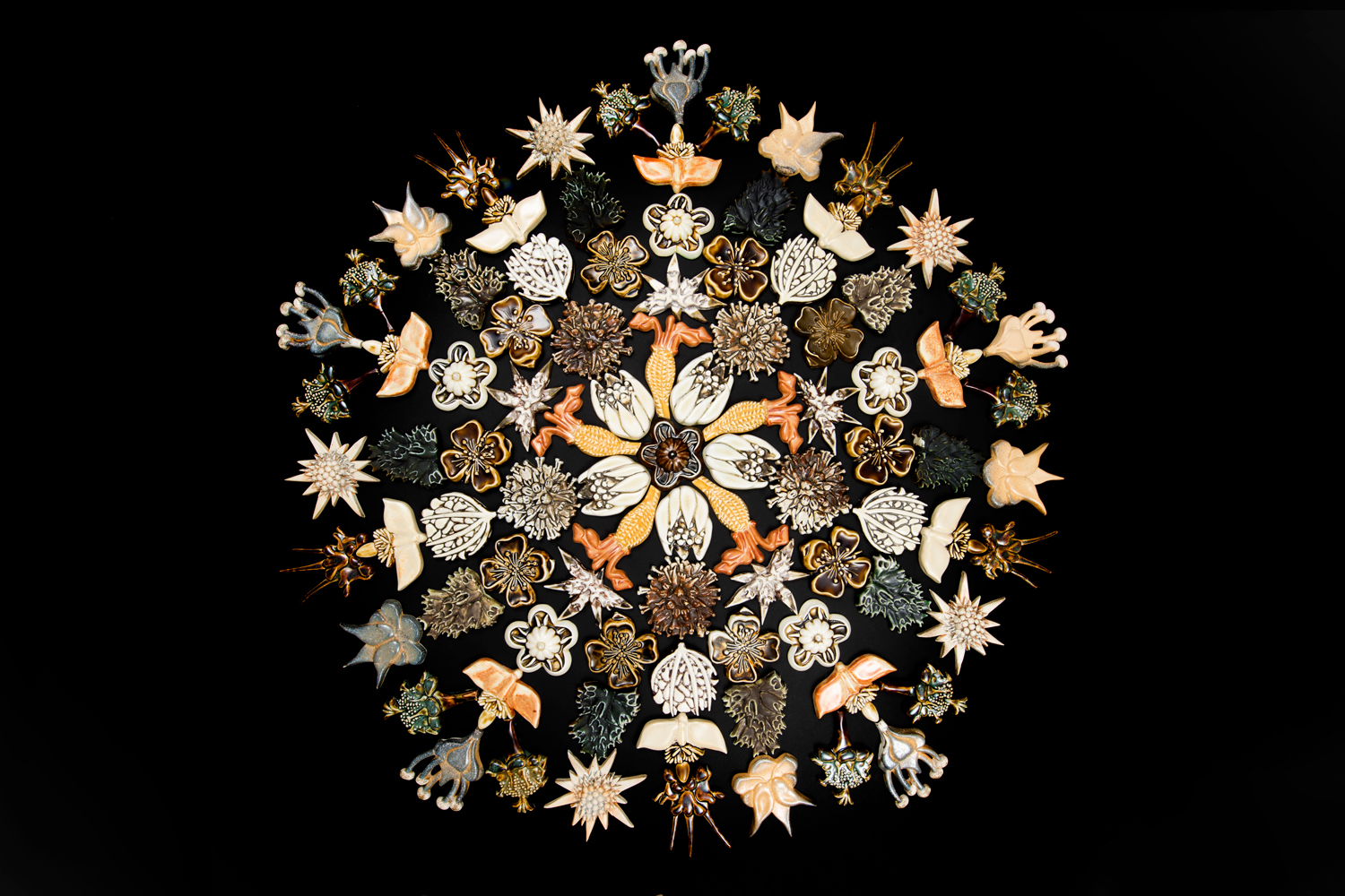 Honewort Roundel is a wall mounted circular arrangement of relief tiles in the shape of plants in hues of reds, browns and creams. The plants are from a spring in Asturias, translated into clay and slip cast in porcelain fired in a wood kiln with soda.