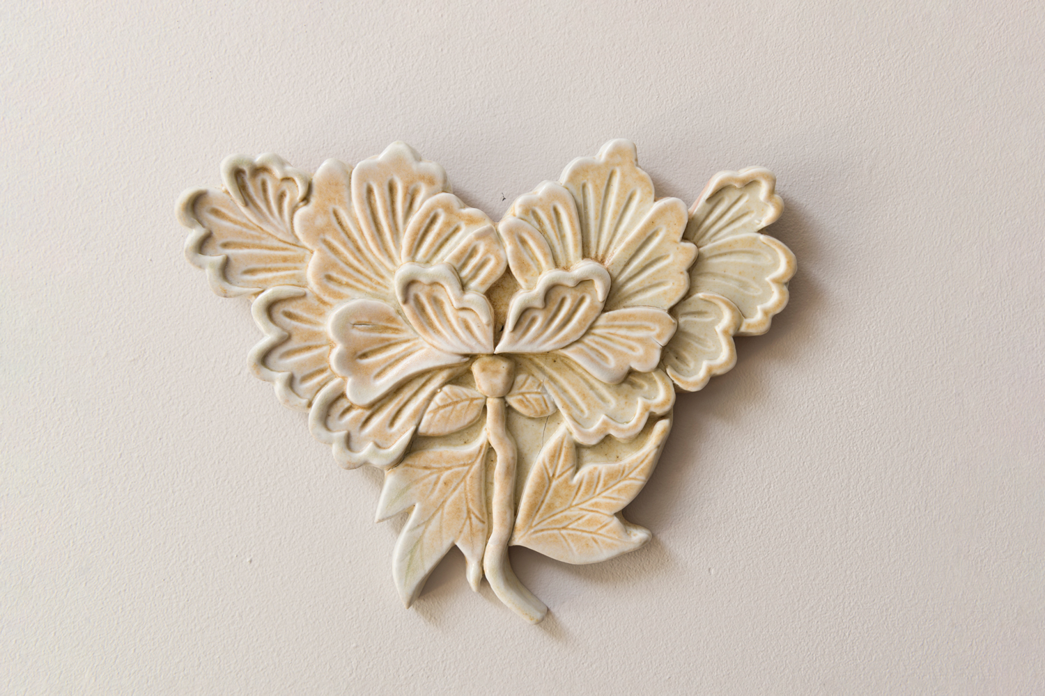 This is a relief tile from the Peonies installation, a wall mounted repeating pattern of relief tiles in the shape of peony flowers consisting of unglazed porcelain fired in a wood kiln for six days. The warm colours and textures were caused by flames and wood ash during the firing.