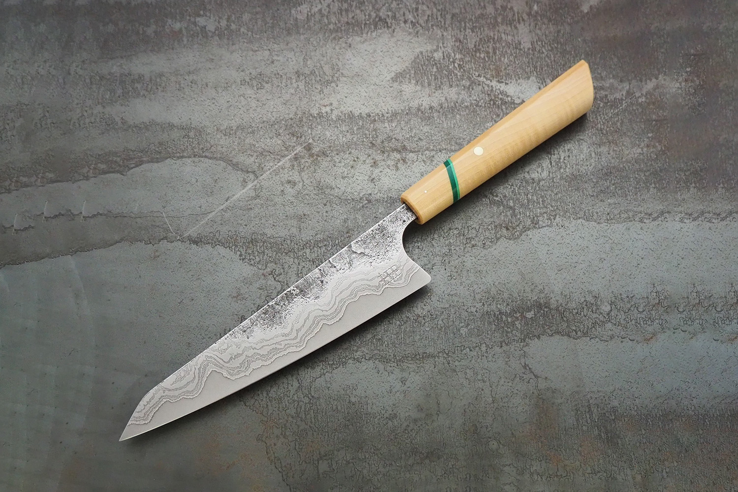 This is a forged Gyuto kitchen knife of Damascus steel.