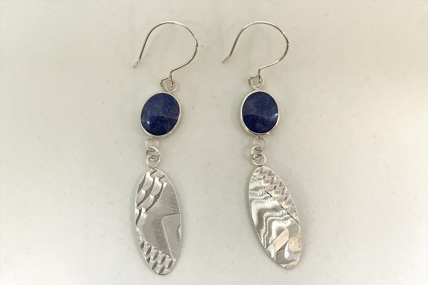 These dangling earrings are composed of sterling silver with hand-applied guilloché in an oval form, as well as bezel set lapis lazuli oval stones at the head of the earring.